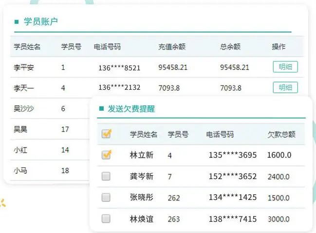 通过校盈易教培行业招生营销系统的财务模块,您可以轻松查询学员的交费记录及明细,对学员的课时费、即时消耗课时进行统计。此外,系统还支持设置欠费提醒,帮助收费人员及时跟进欠费学员,进行催费或续报下期课程。这一功能不仅提高了工作效率,还确保了财务的准确性和及时性,为教育培训机构的稳健运营提供了有力支持。