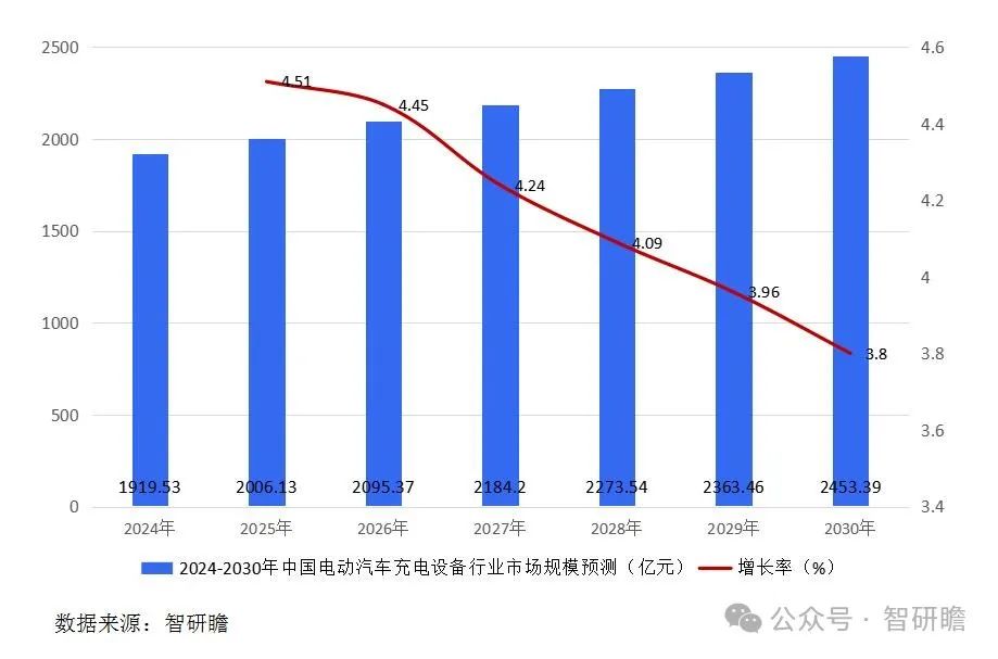 据智研瞻预测,2024-2030年中国电动汽车充电设备行业市场规模增长率在3%-5%,2030年中国电动汽车充电设备行业市场规模2453.39亿元,同比增长3.8%。2024-2030年中国电动汽车充电设备行业市场规模预测如下: