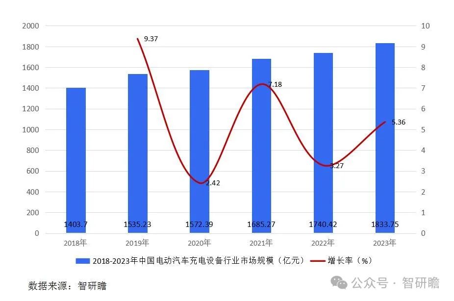 据智研瞻统计显示,2018年中国电动汽车充电设备行业市场规模1403.7亿元,2023年中国电动汽车充电设备行业市场规模1833.75亿元,同比增长5.36%。2018-2023年中国电动汽车充电设备行业市场规模如下: