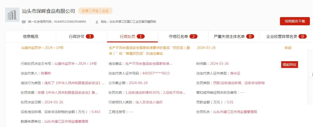 据公示信息,汕头市深晖食品有限公司存在生产不符合食品安全国家标准要求的食品“奶饮品(酸味)”和“草莓奶饮品”的违法事实。