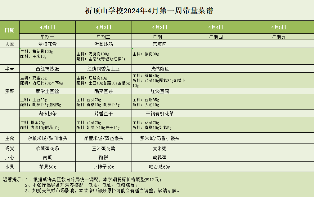 我们将定期公示每周菜谱,每周邀请两位家长不定期到校进行陪餐、参观学生就餐情况,如您有到校陪餐意愿请与班主任老师联系,我们诚挚欢迎您的到来。
