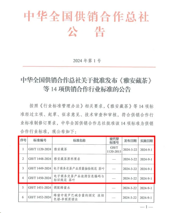 近日,中华全国供销合作总社发布公告(2024年第1号),由中国茶叶流通协会牵头编制的《GH/T 1120-2024雅安藏茶》《GH/T 1448-2024雅安藏茶原料要求》《GH/T 1449-2024电子商务交易产品质量抽检规范茶叶》《GH/T 1450-2024电子商务交易产品追溯信息编码与标识规范茶叶》四项供销合作行业标准正式获批发布。标准发布日期为2024年3月22日,2024年9月1日起实施。