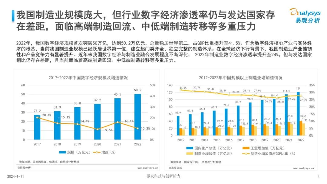- 我国制造业规模庞大,数字经济规模突破50万亿,制造业数字经济渗透率提升至24%。