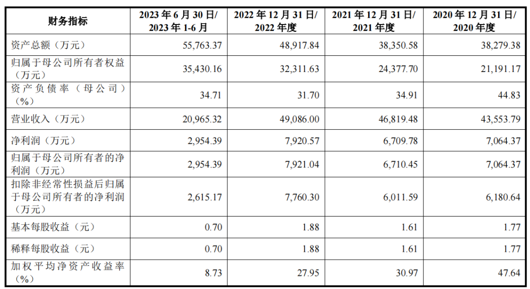 财务方面,2020年—2023年1-6月,公司营收分别为 43,553.79万元、46,819.48万元、49,086.00 万元和20,965.32万元,扣除非经常性损益后归属于母公司所有者的净利润分别为6,180.64 万元、6,011.59万元、7,760.30万元和 2,615.17 万元;主营业务毛利率约超过30%。