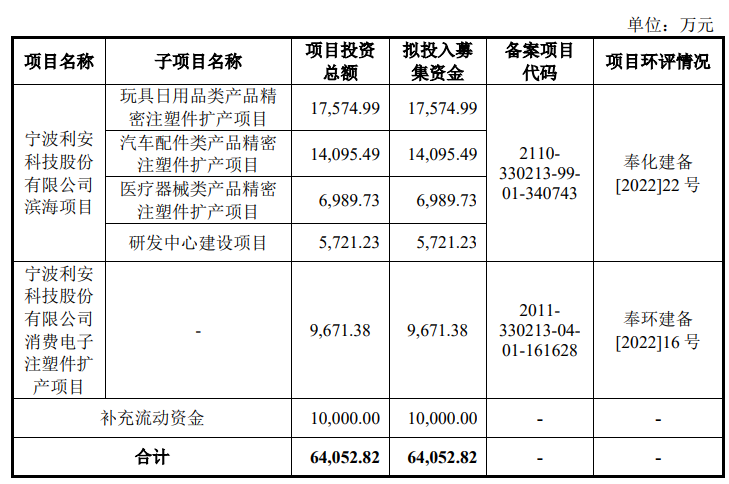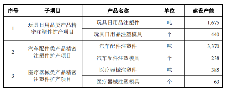 此次,公司计划募资6.41亿元,用于公司玩具日用品类产品、汽车配件类产品、医疗器械类产品、消费电子注塑件等项目建设,预计年产量将达到7,830 吨注塑件和 920个模具。