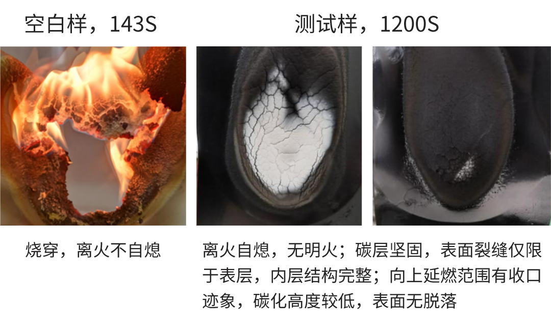 添加2%的Javachem®CT,燃烧时,材料表面形成致密、坚固的炭层,阻隔火焰和热量,显著提升阻燃性能。