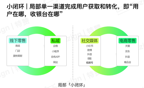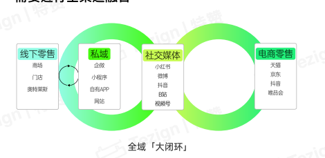 增长范式变化:由关注“店效”转向提升“人效”,从单一渠道的“小闭环”转向全域经营的“大闭环”,营销重心从“商品货架”转向“内容货架”。