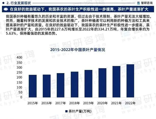 我国茶叶种植有着悠久的历史和丰富的资源,但过去由于技术限制,茶叶产量无法大幅增加。然而,随着科学技术的发展和农业技术的推广,茶叶种植者可以利用新的种植方法和工具来提高茶叶的产量和质量。在良好的效益驱动下,我国茶农的茶叶生产积极性进一步提高,茶叶产量逐渐扩大,由2015年的227.6万吨增长至2022年的334.21万吨,年复合增长率约为5.63%,保持着强劲的发展态势。