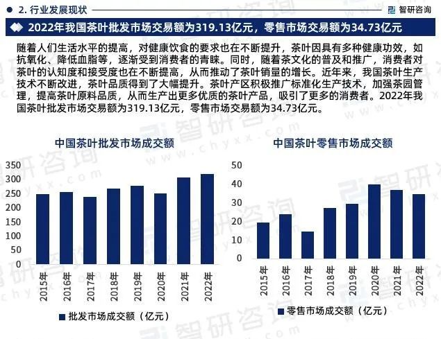 随着人们生活水平的提高,对健康饮食的要求也在不断提升,茶叶因具有多种健康功效,如抗氧化、降低血脂等,逐渐受到消费者的青睐。同时,随着茶文化的普及和推广,消费者对茶叶的认知度和接受度也在不断提高,从而推动了茶叶销量的增长。近年来,我国茶叶生产技术不断改进,茶叶品质得到了大幅提升。茶叶产区积极推广标准化生产技术,加强茶园管理,提高茶叶原料品质,从而生产出更多优质的茶叶产品,吸引了更多的消费者。2022年我国茶叶批发市场交易额为319.13亿元,零售市场交易额为34.73亿元。