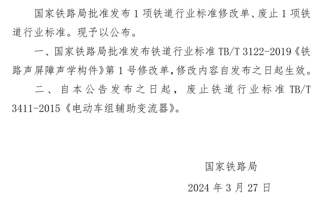 近日,国家铁路局发布了两批铁路行业技术标准,包括《机车车辆滚动轴承 电机轴承》《铁路货运检查技术要求》2项标准,以及TB/T 3122-2019《铁路声屏障声学构件》第1号修改单。