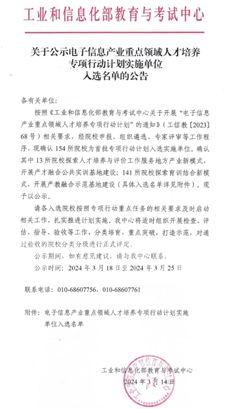 近日,工业和信息化部教育与考试中心公示了电子信息产业重点领域人才培养专项行动计划实施单位入选名单。经过申报竞争和线上答辩,我校成功入选首批拟建产教融合示范基地实施单位。