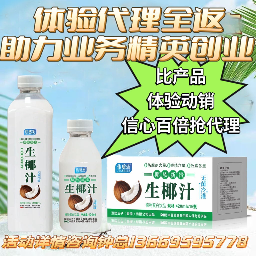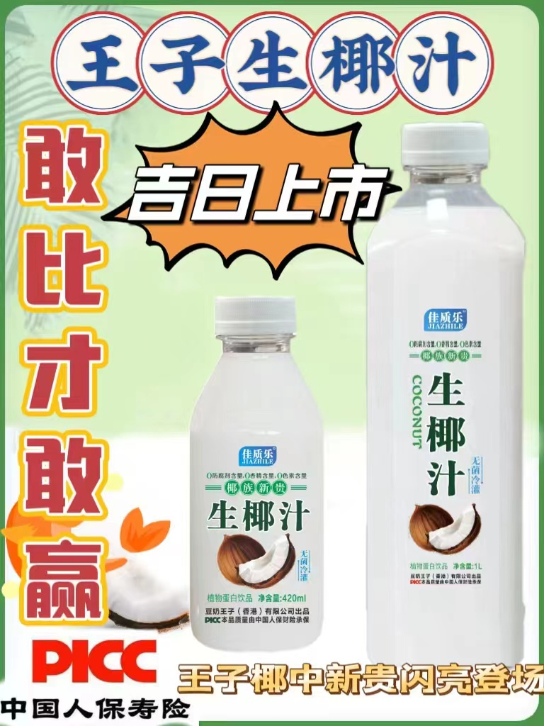 比质量,比口感,比包装,王子生椰汁,椰中新贵,凭过硬品质,敢首次业界推出体验代理全返,让您更安全,更自信。