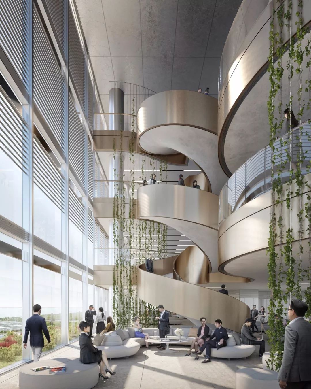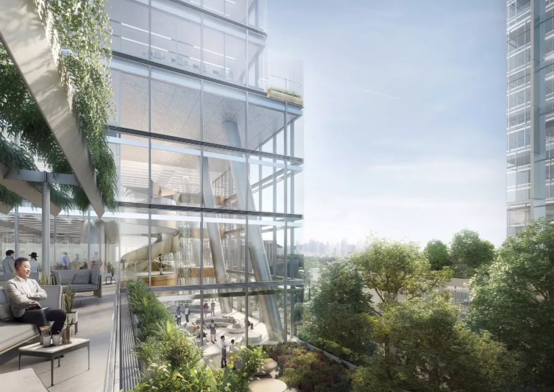 每个街区都是一个独立的城市社区,其楼层由螺旋楼梯连接,鼓励思想交流并改善沟通。这些空间形成了村庄的社交中心,打破了传统的非人性化和沉闷的办公实体,让自然光充满室内,并形成了周围城市和景观的独特优势。中庭是建筑的社交场所,是直接通向露台的聚集点。另一方面,办公楼的升高和凹陷的地面大厅可以创建一个大型的遮荫开放公共广场,与邻近的公共空间和公园相连。