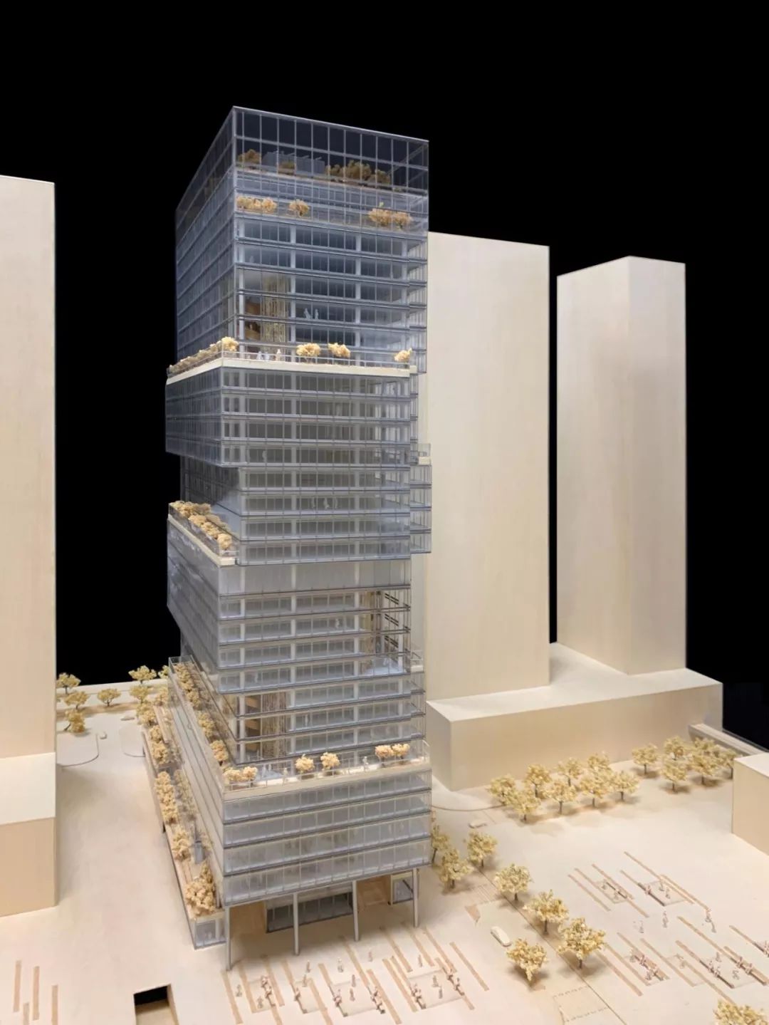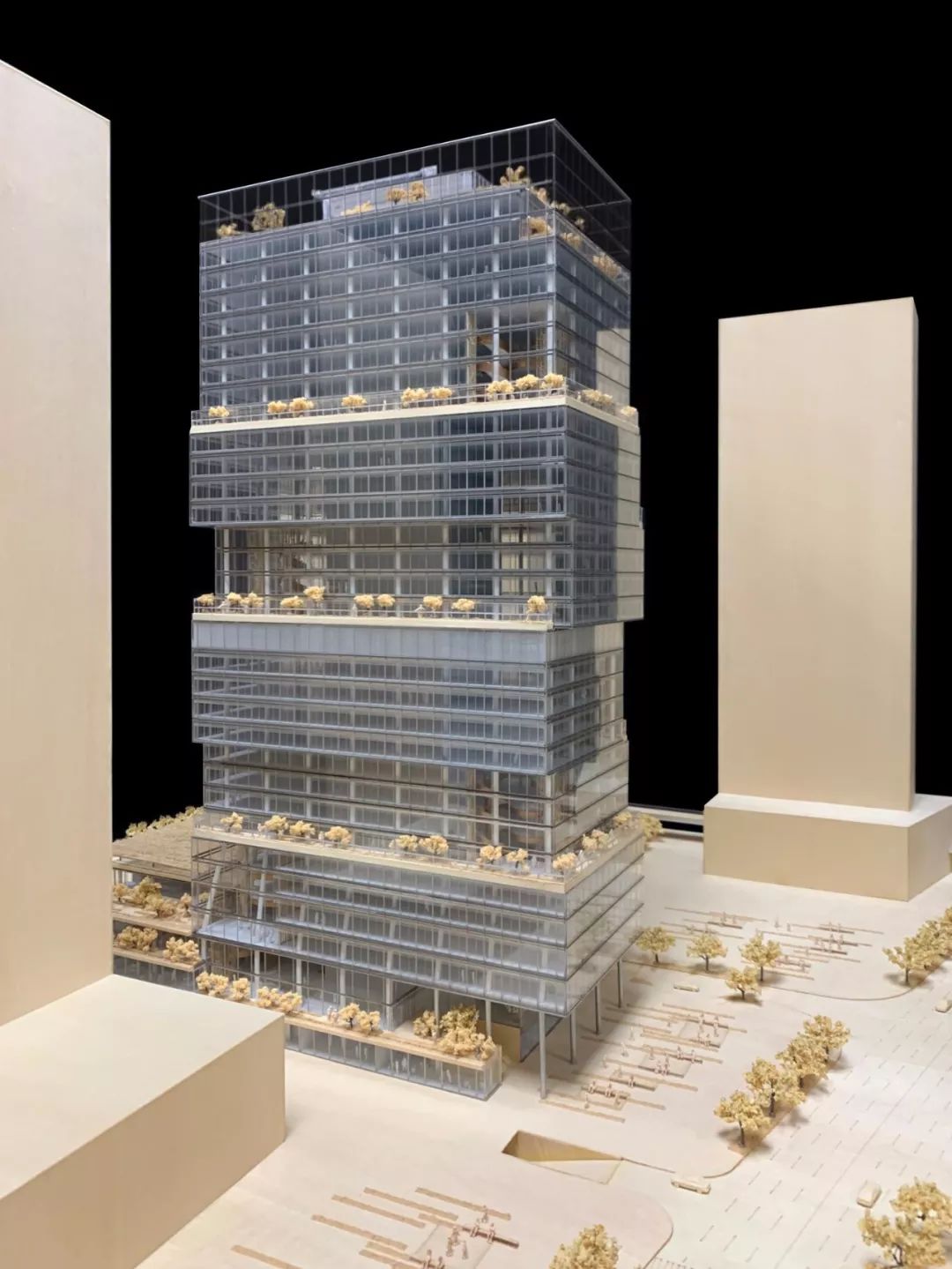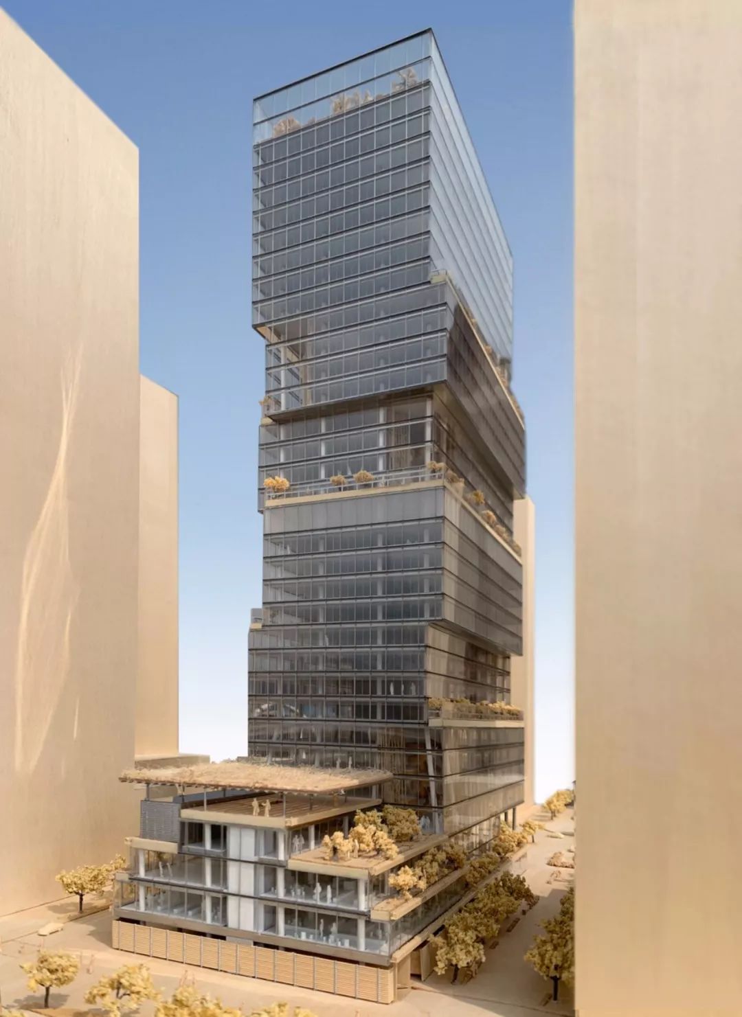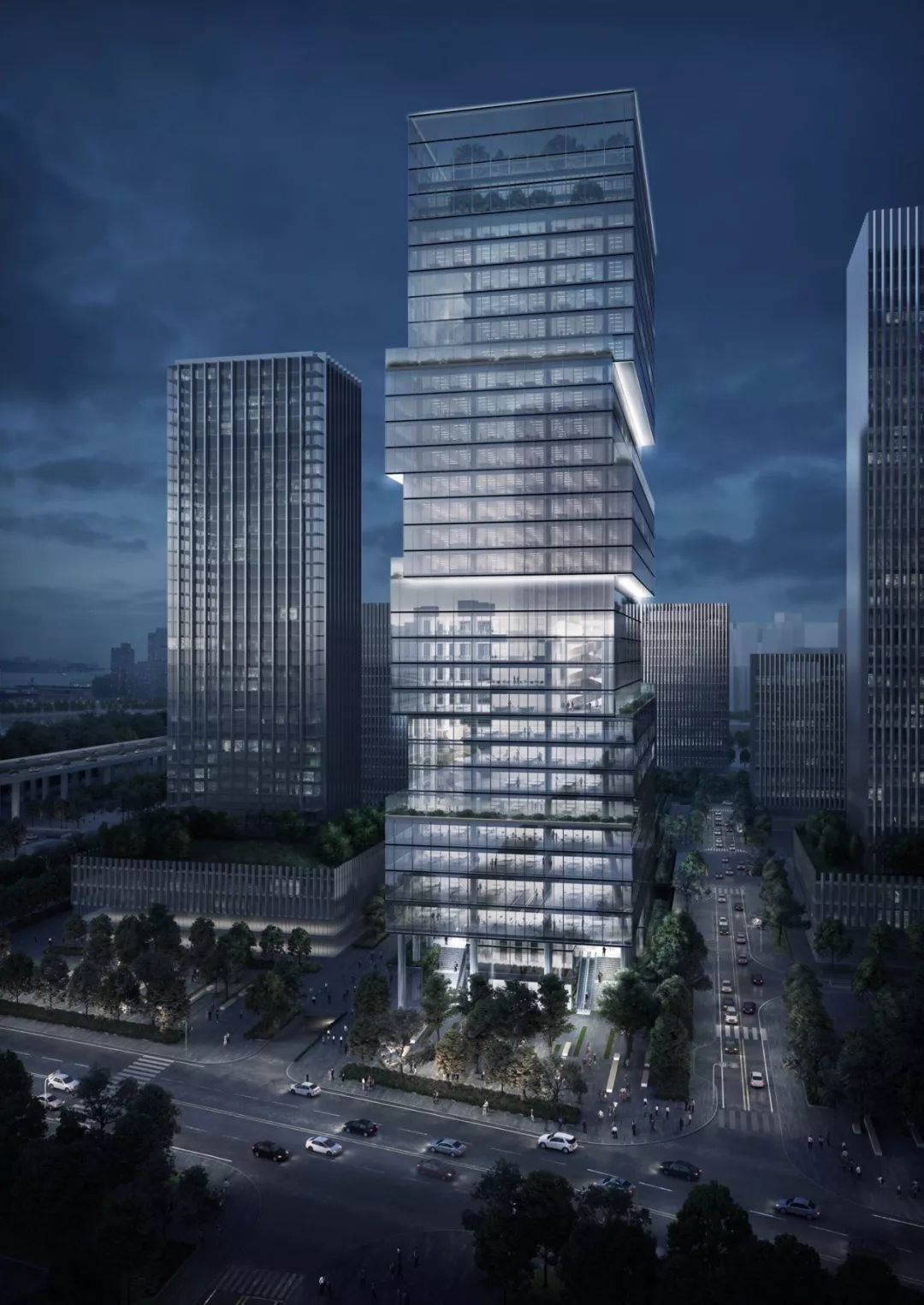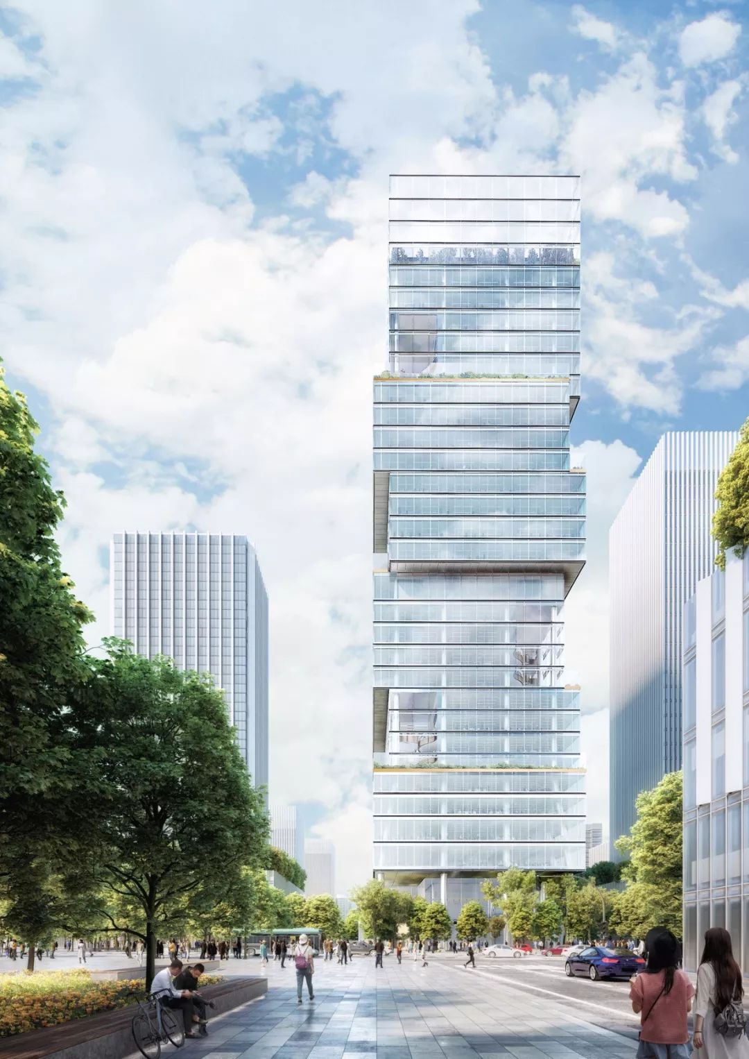 该办公楼位于一个正在开发的社区,可方便前往深圳宝安国际机场和珠江三角洲沿线城市,是“一组移动的体量,将塔楼分解成一系列梯田堆叠的城市街区” 。该项目增加了步行绿地和新的巴士总站,将改善城市环境并为城市提供新的体验。