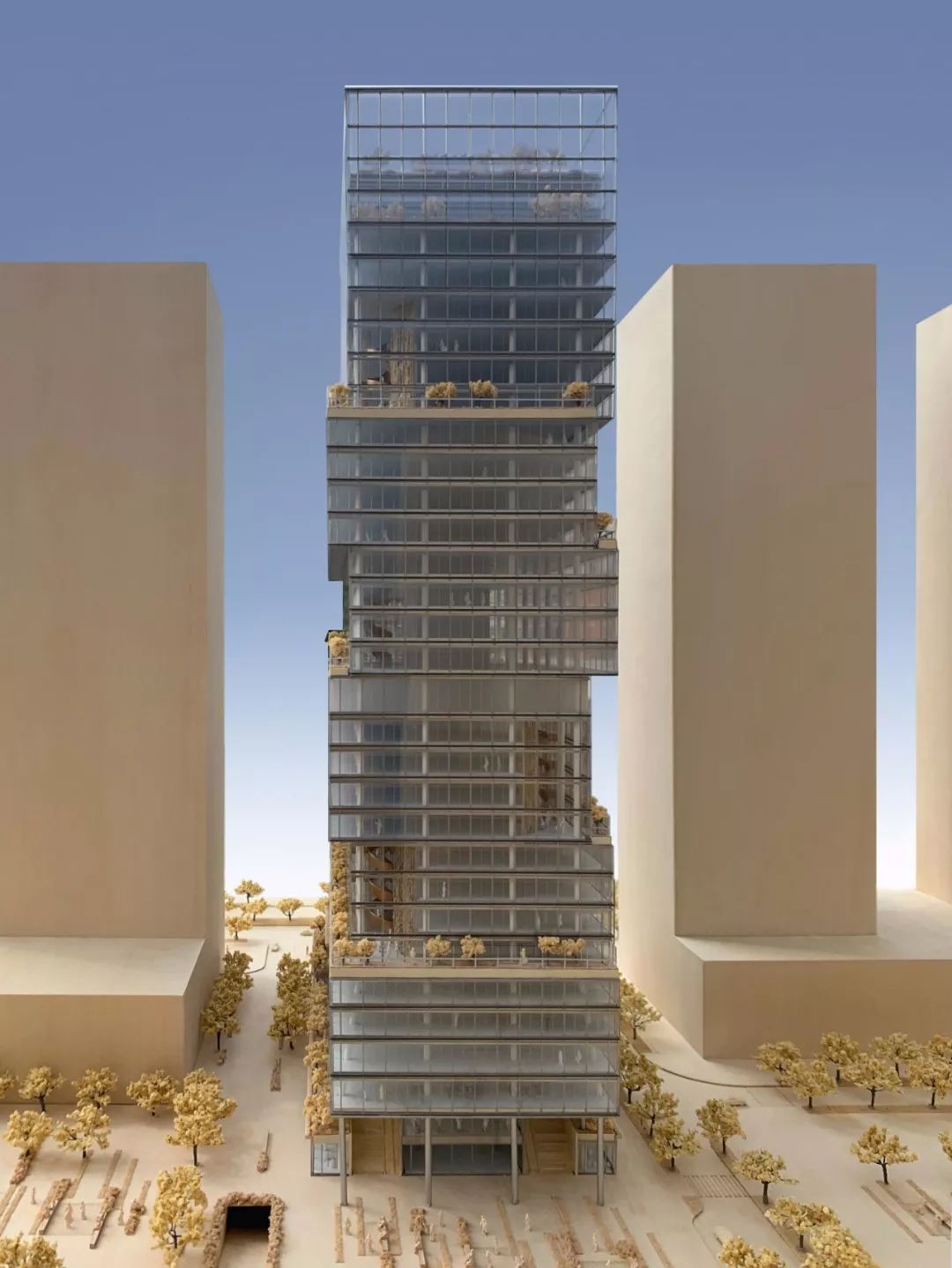 由于靠近机场,高度限制为 150 米,建筑师提出了一种设计,“将整体建筑体分成一系列较小的体量,这些体量可进出,以便更好地将塔楼融入场地规模”环境”。Jaeger Kahlen Partner设计了一个由移动体量、梯级和悬臂组成的组合。