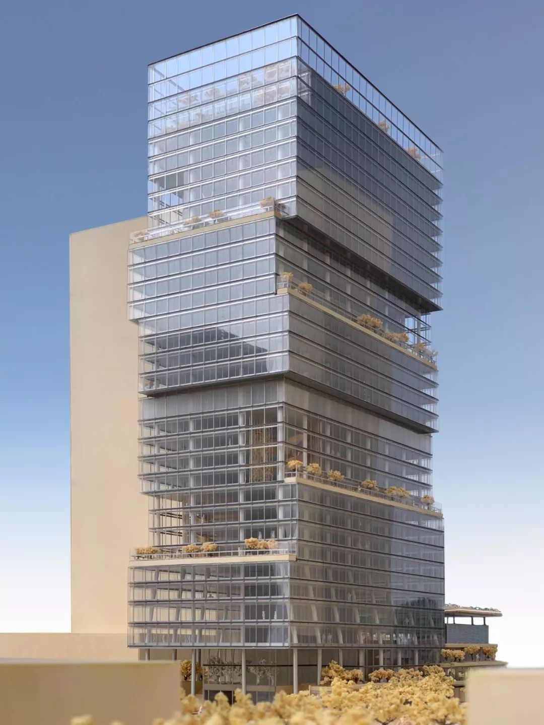 建筑师与Transsolar KlimaEngineering合作,将实用且高效的可持续性技术融入到设计中。例如,“创新的封闭式空腔立面,其气隙中装有遮阳百叶窗,可最大限度地减少太阳热传递,同时在办公室内部和繁忙的室外环境之间提供隔音效果”。此外,“安装了径向冷却系统,以减少持续所需风量的能源需求,[…]高效玻璃最大限度地减少了热量增益和眩光,无障碍露台减少了热岛效应并改善了自然通风”。
