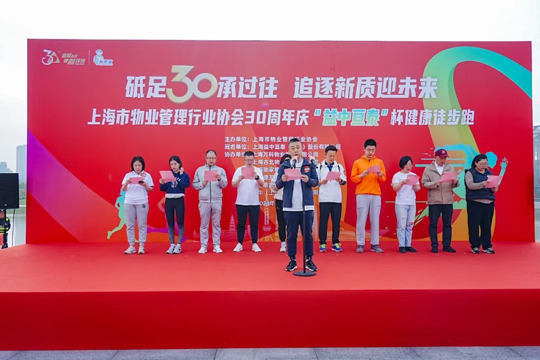 在这春回大地,万物竞发的美好时节,为更好动员号召本市物业管理行业持续提高物业服务质量,提升服务满意度;同时,以上海市物业管理行业协会成立30周年庆为契机,进一步展示行业朝气蓬勃、积极向上的精神面貌。3月30日,市物业协会在黄浦江畔的世博文化公园举办今年首场纪念庆祝活动——砥足30承过往 追逐新质迎未来“益中亘泰”杯健康徒步跑活动。来自协会各代表处、专委会和100余家会员单位的参赛选手,积极报名参加本次活动。协会名誉会长、党支部书记季祖坚、常务副会长周宏伟、秘书长潘国强、市房管局团工委副书记龙腾以及协会部分副会长和物业企业负责人到场参加活动。