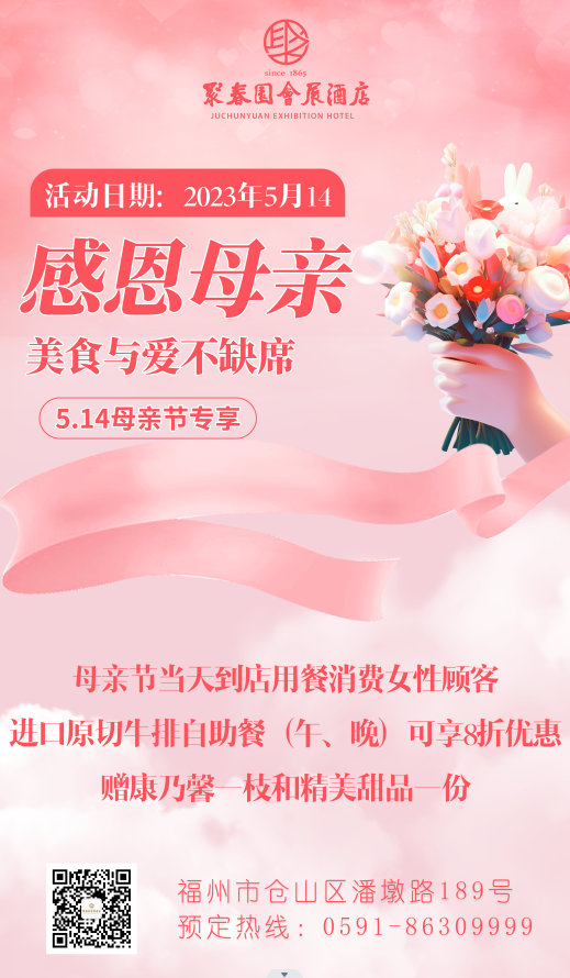 温情五月,感恩相伴,在即将到来的母亲节,聚春园会展酒店助您表达爱意,将平时说不出口的爱,化于方寸间呈现,让您与她馔享美好时光。