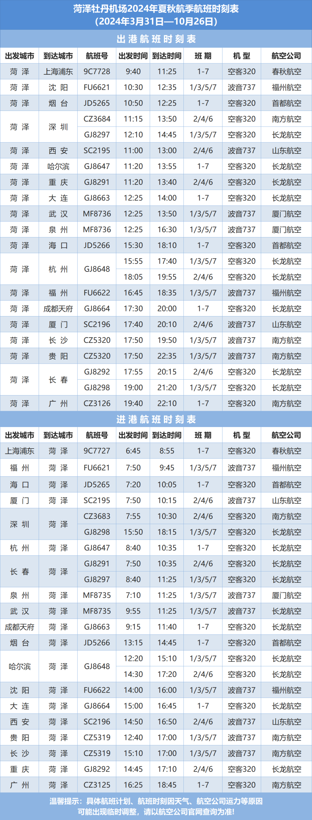 2024年夏秋航季航班计划