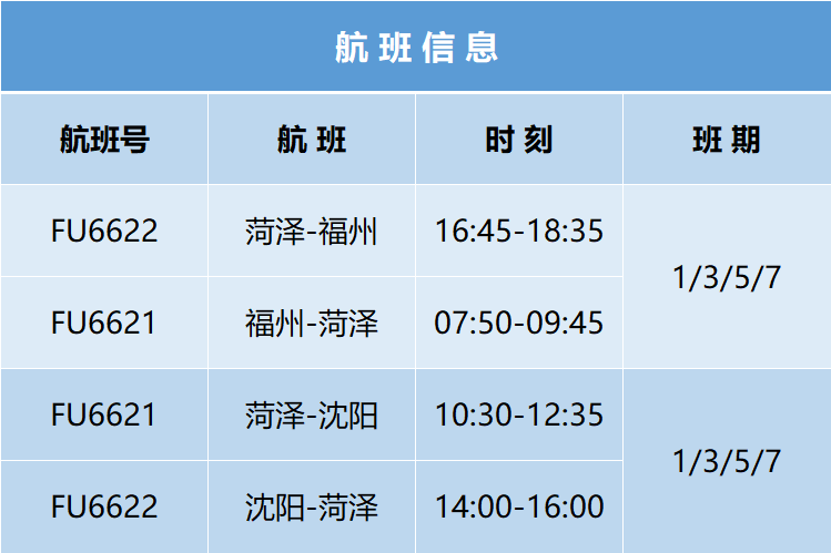 开通由福州航空执飞的“福州=菏泽=沈阳”航线