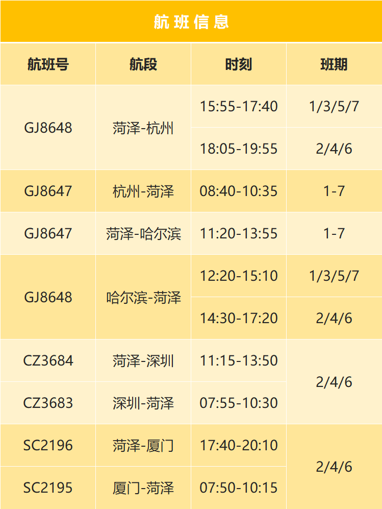 为方便旅客出行及国际转机,菏泽至杭州起飞时刻由21:50优化至18:05,哈尔滨至菏泽起飞时刻由18:05优化至14:30,每周2/4/6运营的菏泽至深圳起飞时刻由16:25优化至11:15,菏泽至厦门起飞时刻由19:40优化至17:40