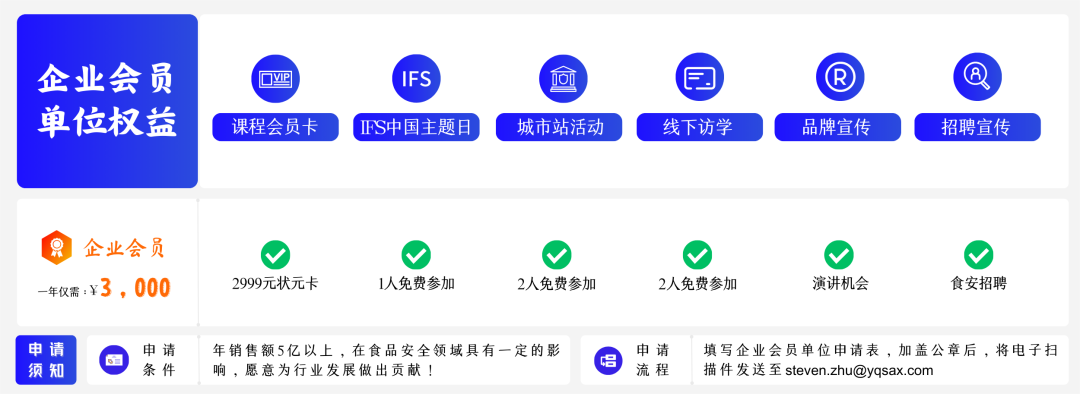 享有权益:一起食安行企业会员单位,享2999状元卡、免费参加IFS中国主题日、免费参加一起食安行城市站活动、免费参加线下访学、品牌宣传、招聘宣传等权益。