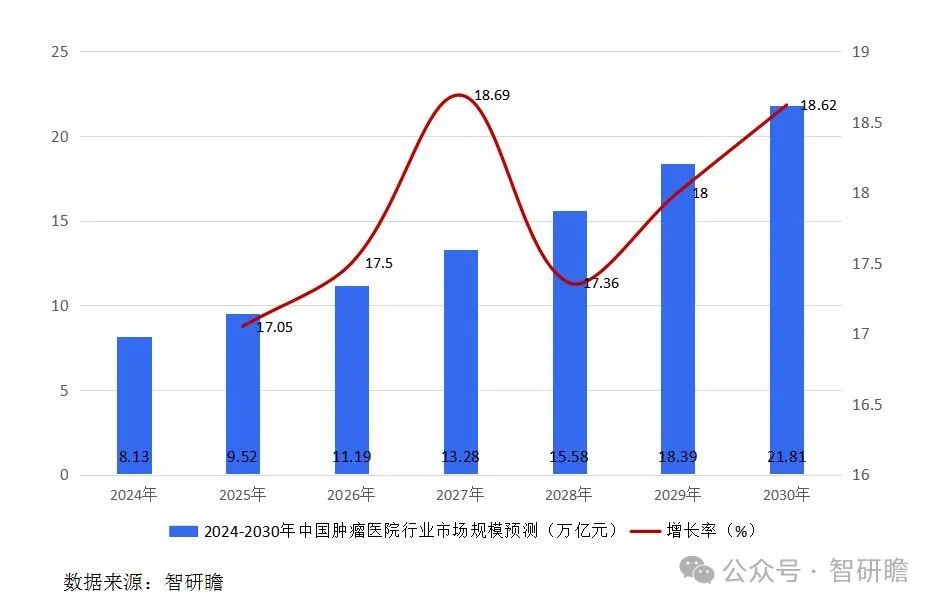 据智研瞻预测,2024-2030年中国肿瘤医院行业市场规模增长率在17%-19%,2030年中国肿瘤医院行业市场规模21.81万亿元,同比增长18.62%。2024-2030年中国肿瘤医院行业市场规模预测如下:
