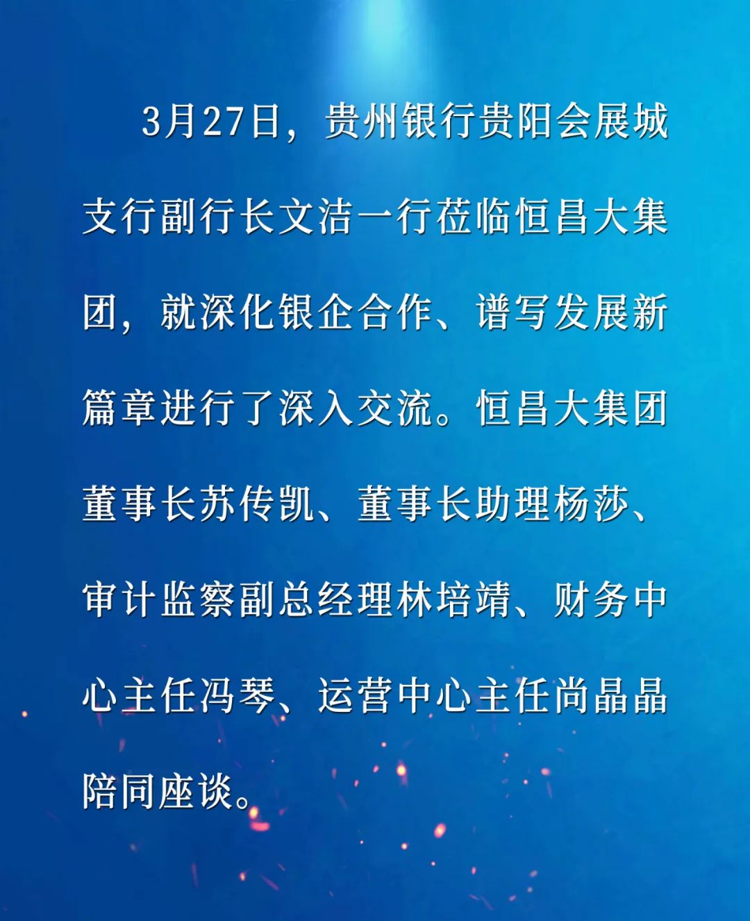 文洁副行长对恒昌大集团取得的成就给予高度评价,并表示贵州银行贵阳会展城支行作为地方金融单位,始终坚持服务实体经济,积极支持地方优势产业的发展。她指出,双方应加强沟通对接,探索银企合作更多模式,实现互利共赢。