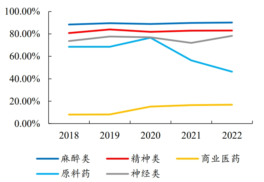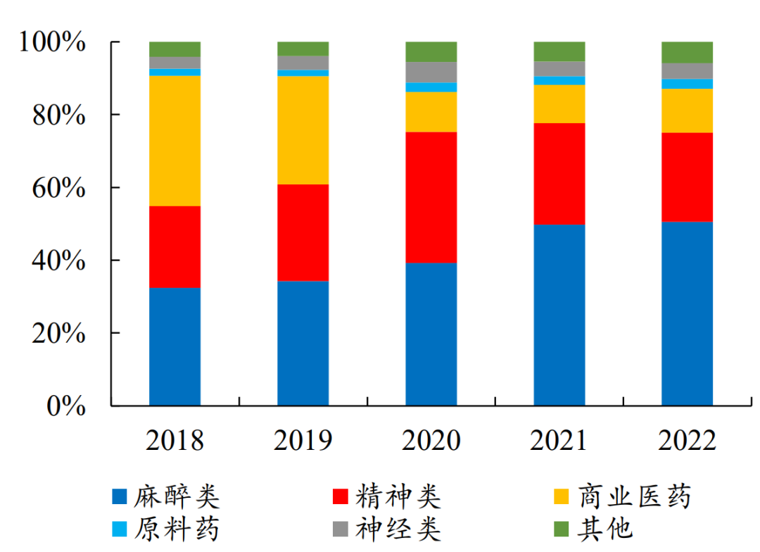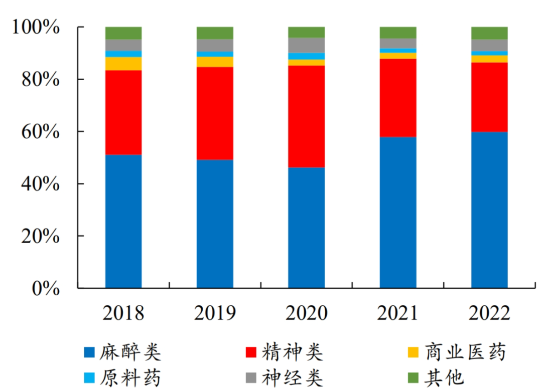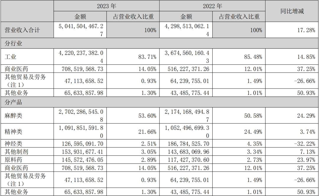 麻醉类、精神类和神经类业务构成公司三大核心竞争力,2023年三大核心业务合计贡献 77.77%的收入。