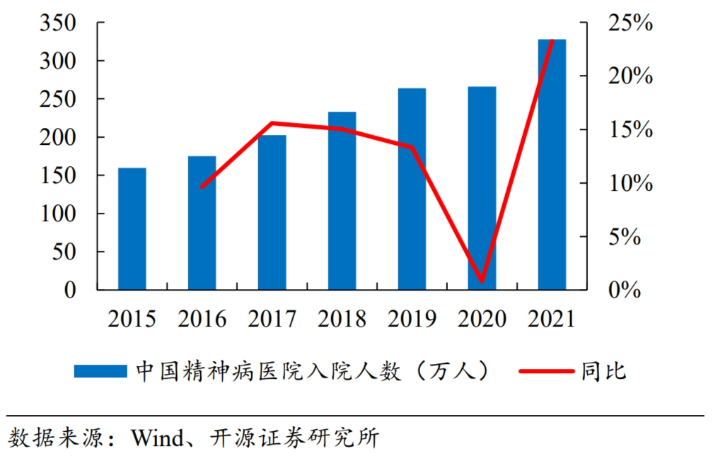 随着社会各方面竞争压力不断加大,人们情绪得不到有效释放,致使 2013 年以来精神类疾病患病率呈显著上升趋势,患病率由 2013 年的 1.5‰增长至 2018 年的 3.5‰,精神病医院入院人数也由 2015 年的 159.7 万人增长至 2021 年的 327.7 万人。