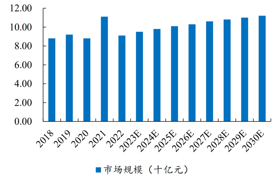 根据弗若斯特沙利文数据,2018 年至 2022 年,中国全身麻醉剂市场规模由 88 亿元上升至 91 亿元,复合增长率达到 0.8%,预计 2023-2030 年中国全身麻醉剂市场规模将由 95 亿元上升至 112 亿元,2023 年至 2030 年的复合年增长率为 2.4%。