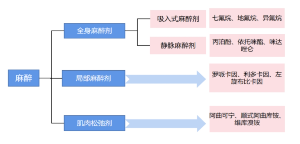 麻醉类药物一般分为全身麻醉剂、局部麻醉剂及肌肉松弛剂。
