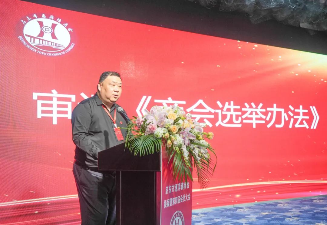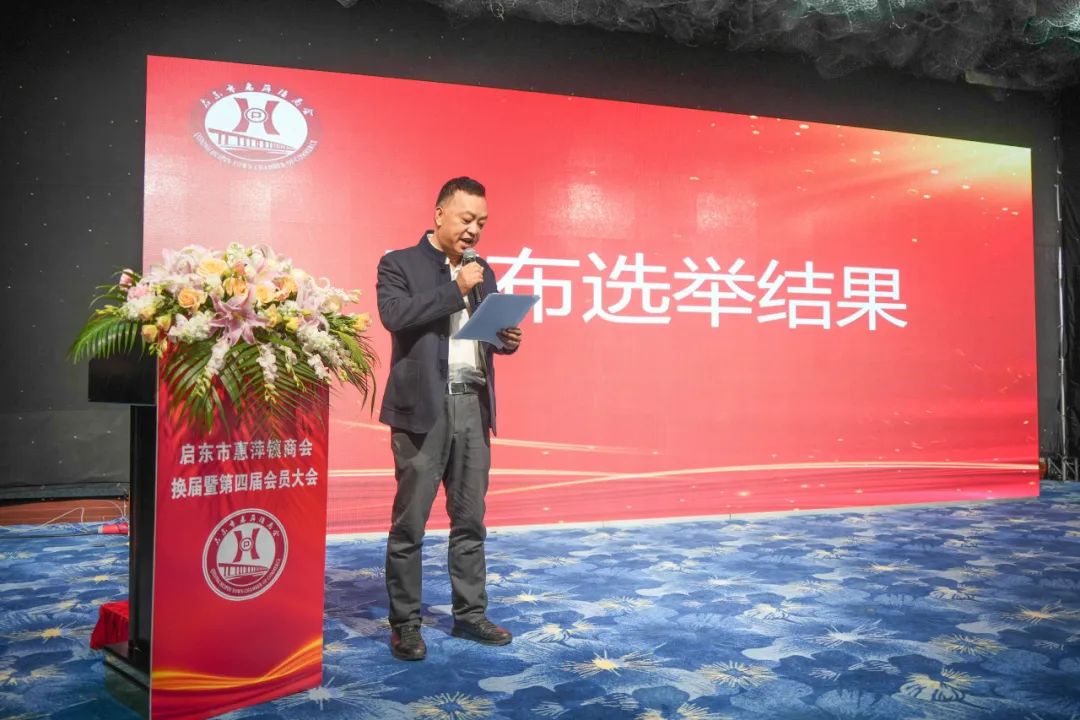 商会副会长顾永伟为大家宣读《启东市惠萍镇商会换届选举办法》(草案),会上选举出新一届领导班子。