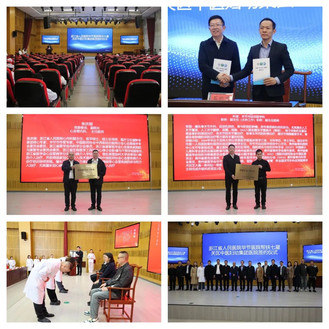 浙江省人民医院毕节医院党委副书记、院长张骏,七星关区中医妇幼集团医院院长宋洪利共同签订《医疗卫生对口帮扶协议书》;七星关区人民政府党组成员、高新区管委会副主任唐璇授牌张庆刚专家工作站,七星关区卫生健康局党委委员谢洪授牌李国专家工作站,我院儿科王海龙拜浙江省人民医院毕节医院儿内科主任兼教学科科长赵欣黔为师,新生儿科陈丹拜浙江省人民医院毕节医院新生儿科主任许萍为师,放射科王晓鑫拜浙江省人民医院毕节医院放射科主任徐松为师。