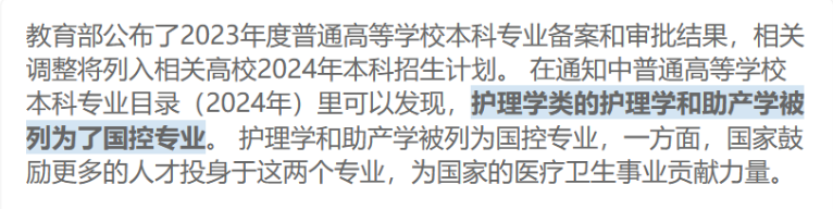 3月19日,教育部公布了2023年度普通高等学校本科专业备案和审批结果,并发布2024年普通高等学校本科专业目录。此次专业设置工作中,结合经济社会发展需求变化和专业布局情况,、护理学、助产学调整为国家控制布点专业。
