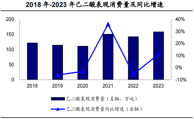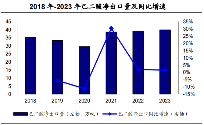表观消费量达到158.33万吨,同比变化11.20%;2018年至2023年己二酸每年平均净出口量为35.95万吨,年复合增速2.52%;2018-2023年年平均表观消费量为133.06万吨,年复合增速5.39%。