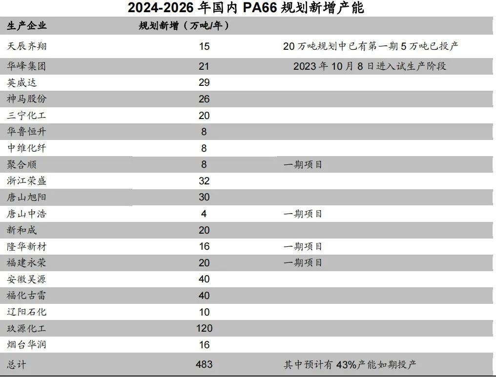 截至2023年10月,我国PA66新增产能规划483万吨。考虑到项目建设的不确定性和需求匹配度,预计规划产能中有43%能于2026年底前投产。