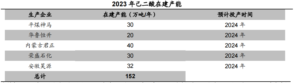 国内计划新增己二酸产能较多,预计其中80%能够于2024-2026年投产。据测算,2026年前己二酸计划新增产能共为152万吨。考虑到项目建设的不确定性,截至2026年底,预计己二酸80%计划新增产能投产,约为121.6万吨。