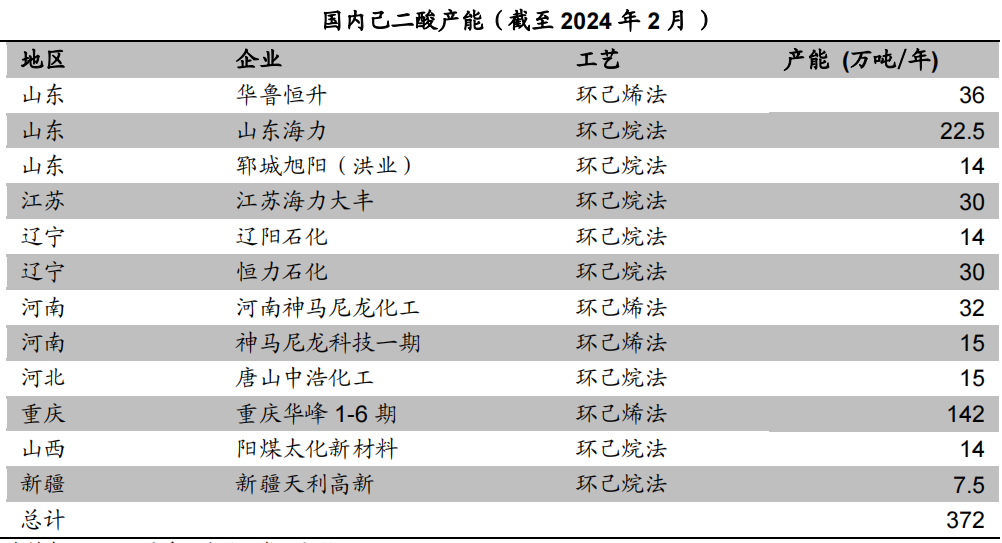 截至2024年2月19日,国内己二酸产能总计372万吨/年。
