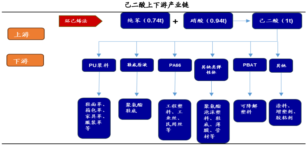 己二酸上游参与主体为基础化工品,主要为纯苯和硝酸。下游产品主要为PU浆料、鞋底原液、PA66、PBAT等,应用领域主要为人造革、泡沫塑料、工业丝、可降解塑料等。