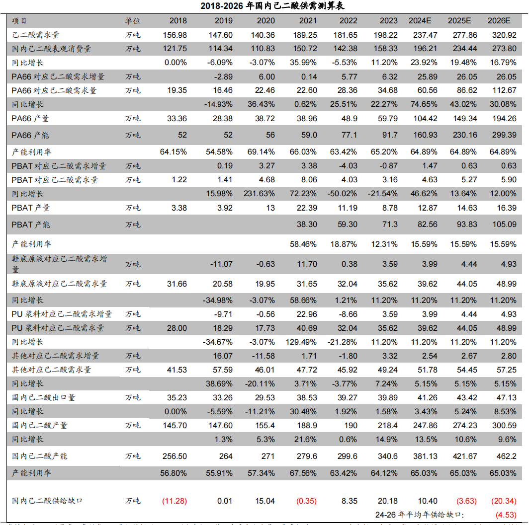 预计2024-2026年PA66平均每年拉动国内26万吨己二酸需求。