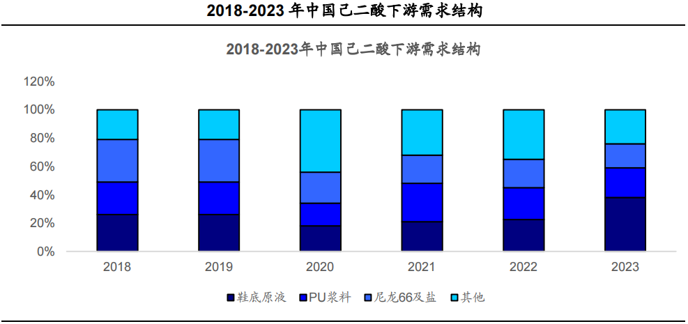 聚氨酯材料中的PU浆料与鞋底原液构成了己二酸的主要下游需求。根据百川盈孚数据,2023年我国己二酸下游消费结构中鞋底原液占比38%,PU浆料行业占比21%,尼龙66行业占比17%。