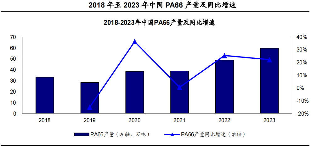 2023年我国PA66产量为59.79万吨,同比增长22.27%,2018-2023年PA66产量年复合增速12.22%。