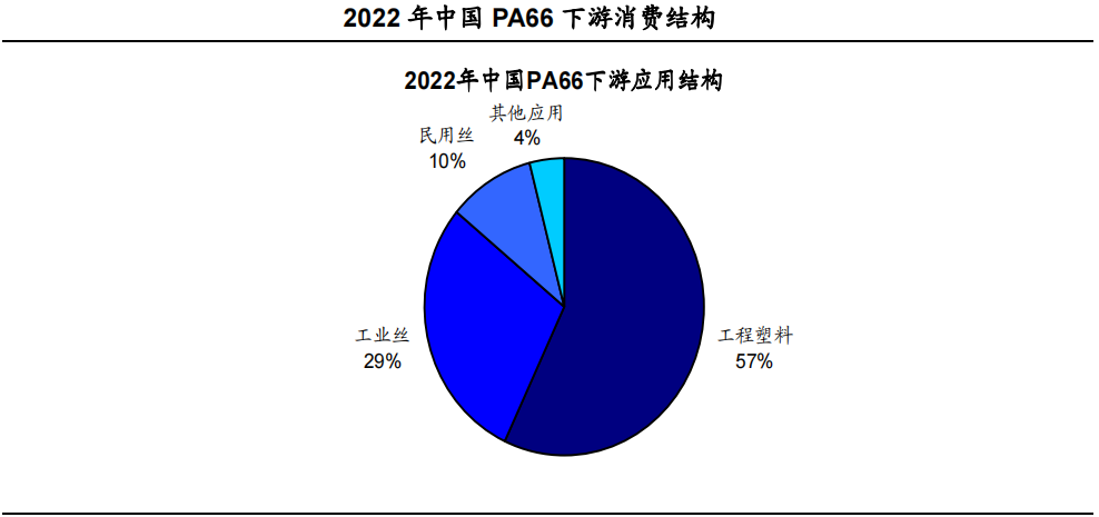中国PA66主要下游消费领域为工业丝及工程塑料,终端领域为汽车制造、电子电器。民用丝产品因PA66相较于竞品PA6价格较高、国内尼龙66行业供给有限而发展缓慢。2022年我国尼龙66在工程塑料上的应用占比为57%,工业丝占比为29%,民用丝占比为10%,其他应用占比约为4%。