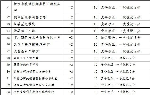 衡水市在全市推行餐饮行业食品安全记分管理,旨在将食品安全主体责任落实、违法行为查处、食品安全管理人员培训和自律守法意识强化有机融合,督促餐饮服务单位自觉提高餐饮食品安全管理水平,防范化解食品安全风险。2023年,记分管理在2个县区率先试行,取得良好效果。2024年,餐饮行业记分管理在全市全面推行。