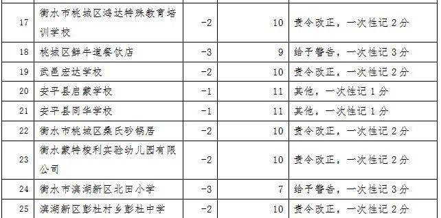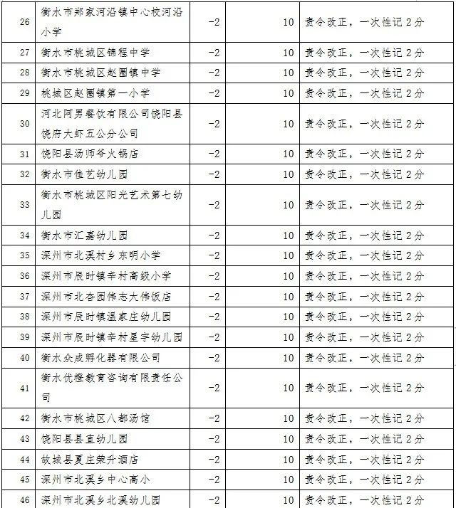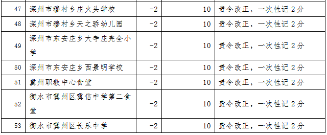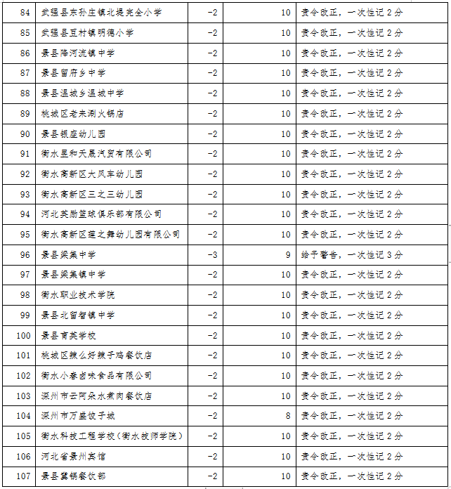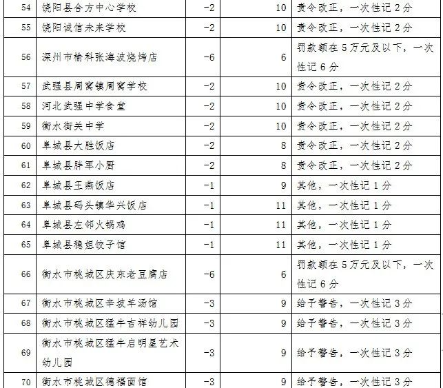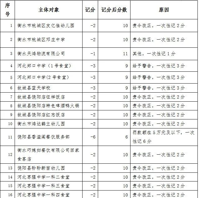 餐饮行业食品安全记分管理实施扣分制,每年度满分12分,每次根据餐饮食品安全违法违规行为的后果严重程度进行相应的扣分,对记分达到一定分值的餐饮服务提供单位负责人、食品安全总监和食品安全员等食品安全管理人员采取考核学习、责任约谈、记入“0分榜”等措施。同时,为方便管理和消费者查询,衡水市市场监督管理局研究设计配套的微信小程序,实现记分、考试、学习、查询等全过程网络管理。现将2024年3月份全市餐饮行业记分情况公布如下(截至2024年3月31日15:00)。