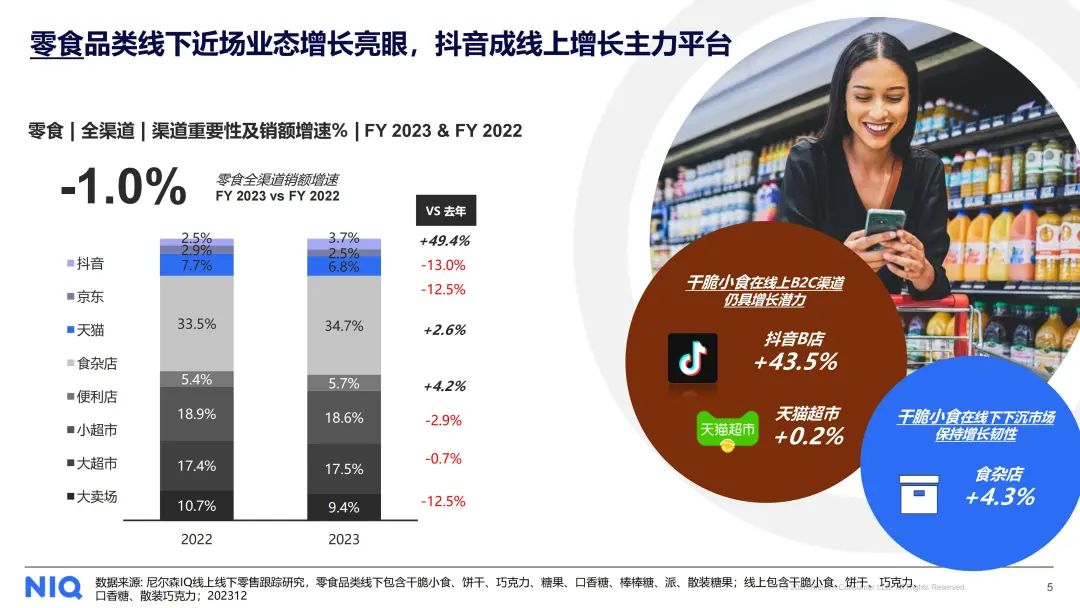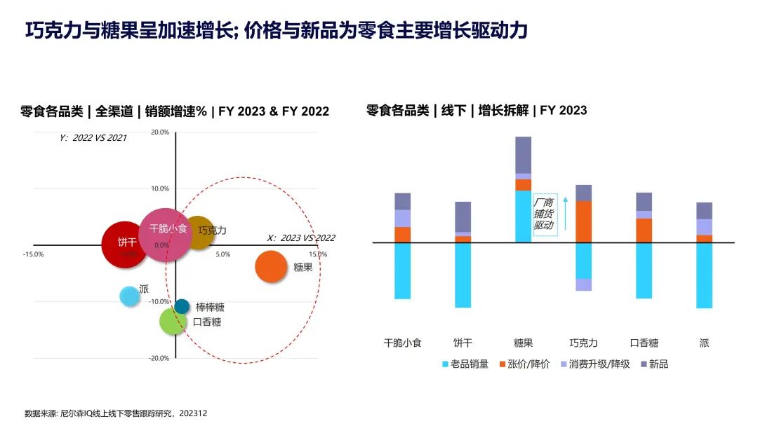 在线上方面,抖音成为主要的增长动力,而传统的线上渠道在零食子类方面去年均出现了不同程度的下滑。因此,建议线上业务更多地关注内容电商的发展。同时,线下业务也应将目光投向食杂店,因为他们在去年的增速表现更为优异。