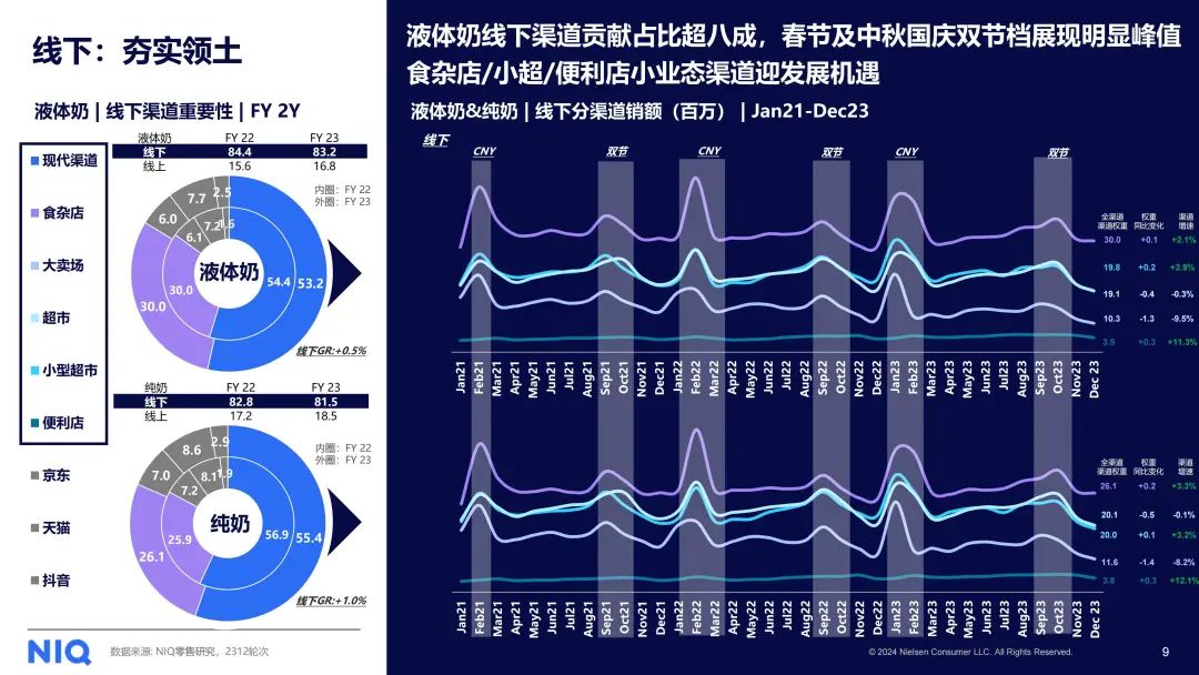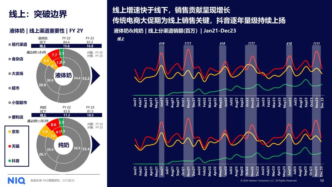 在线上市场方面,无论是液态奶还是纯奶,阿里、京东等电商平台均呈现出下滑态势。相反,以抖音为代表的兴趣电商平台却实现了显著增长。未来,兴趣电商正逐渐成为推动牛奶行业增长的重要力量。