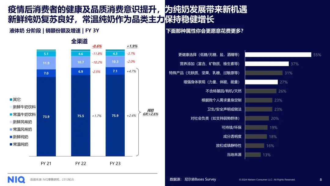 去年,尽管整个牛奶行业呈现下滑趋势,但纯奶和白奶的细分市场却实现了增长。这一趋势与消费者对饮品中糖分含量的关注程度密切相关。现代消费者对于饮料中是否添加有健康成分,以及饮用后是否对身体有益,越来越重视。