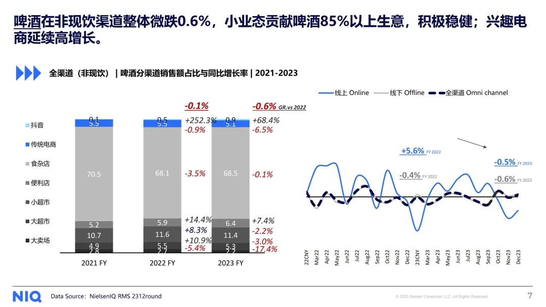 从渠道去看啤酒的零售端,食杂店在啤酒零售市场占据主导地位。在众多渠道中,便利店表现突出,增长率高达7.4%,成为市场新兴力量。同时,抖音电商增长明显,啤酒零售市场渠道结构正在发生深刻变化,渠道间竞争日益激烈。